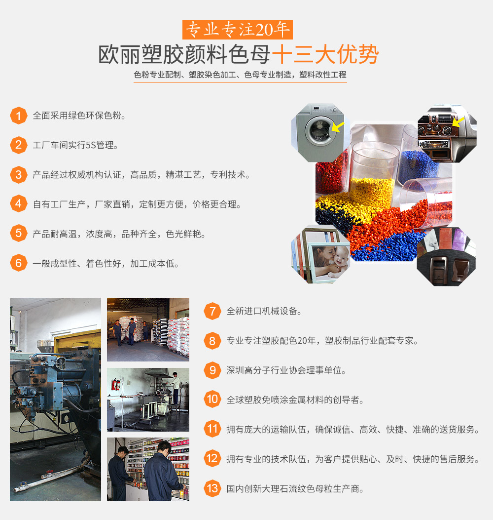 作為專(zhuān)業(yè)的配色服務(wù)及色母料制造商,“歐麗”在技術(shù)注重學(xué)習(xí)吸納業(yè)內(nèi)技術(shù)研究成果不斷創(chuàng)新,同時(shí)引進(jìn)先進(jìn)的生產(chǎn)和檢驗(yàn)設(shè)備,不斷提高產(chǎn)品質(zhì)量和服務(wù)水平。我們的服務(wù)包括色粉專(zhuān)業(yè)配制、塑膠染色加工、色母專(zhuān)業(yè)制造,塑料改性工程(有防火、加阡,增韌等)。
